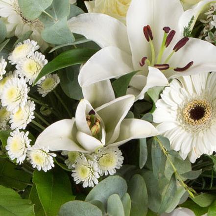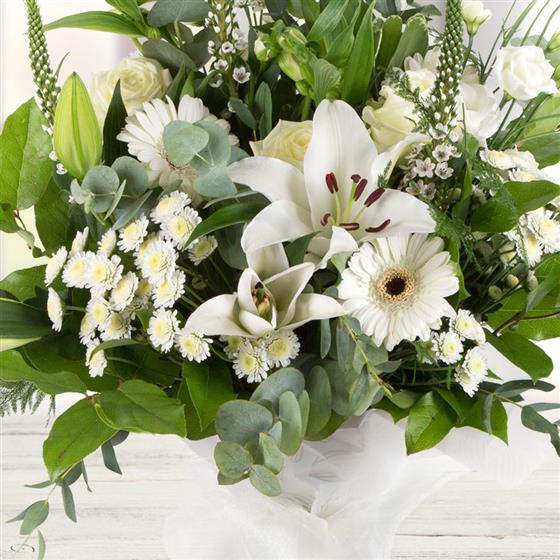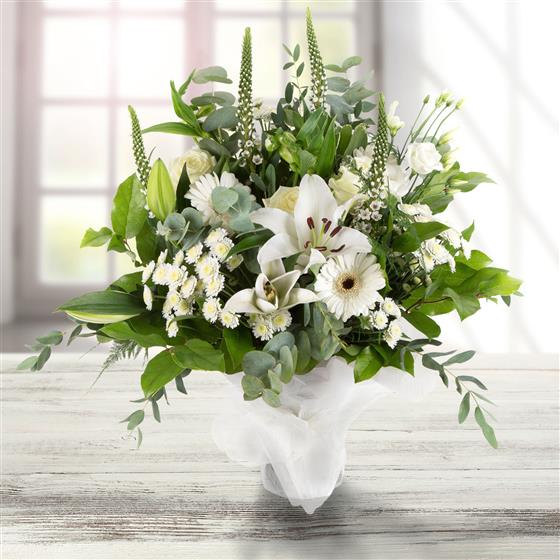 An elegant hand-tied bouquet of white lilies, roses, mini gerberas, chrysanthemums and flowing foliage.