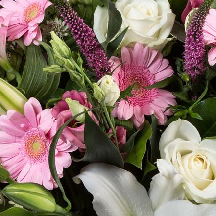 A scented bouquet including oriental lilies, veronica, roses, gerberas and lisianthus presented in a matching gift bag.