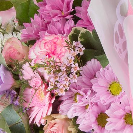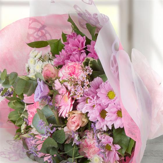 A simple hand-tied bunch of pink and lilac blooms including gerberas, chrysanthemums, carnations and alstromeria.