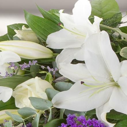 Whites and purples simply combined to create a classic traditional bouquet, including lilies, iris, september flower and limonium.